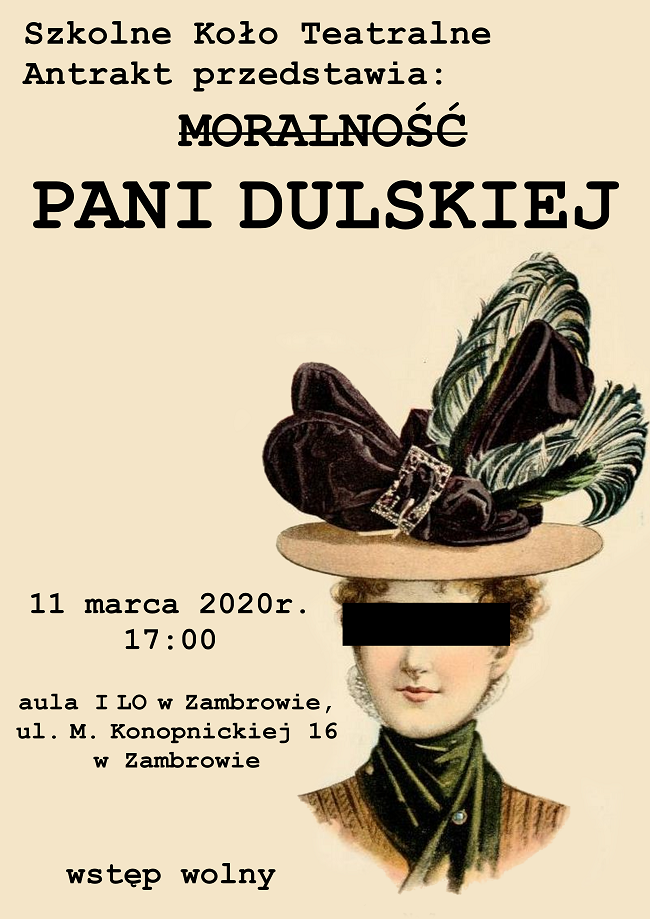Serdecznie zapraszamy na premierę sztuki pt. „Moralność pani Dulskiej” Gabrieli Zapolskiej w wykonaniu Szkolnego Koła Teatralnego Antrakt. Przedstawienie będzie miało miejsce w środę, 11 marca w auli I Liceum Ogólnokształcącego im. S. Konarskiego w Zambrowie, ul. M. Konopnickiej 16. Początek spektaklu zaplanowano na godz. 17:00.