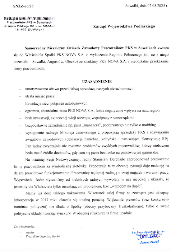 - Na ostatniej Sesji Nadzwyczajnej, radny Stanisław Derehajło zaproponował przekazanie firmy pracownikom za symboliczną złotówkę. Propozycja ta w obecnej sytuacji daje nadzieję na dalsze prawidłowe funkcjonowanie. Pracownicy najlepiej zadbają o swój majątek i warunki pracy. Wypowiedzi, które słyszeliśmy od niektórych radnych wywołały w nas niepokój i ukazały, że jesteśmy dla Właściciela tylko nieustającym problemem, tzw. „,wrzodem na dupie” - napisał zastępca przewodniczącego zarządu SNZZ Pracowników PKS w Suwałkach Janusz Złocki.