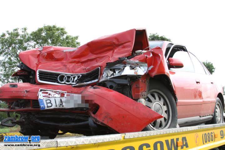 Nietrzeźwy kierowca Audi chciał wyprzedzić ciągnik na podwójnej ciągłej przed ruchem wahadłowym. Dostał się pod ciężarówkę