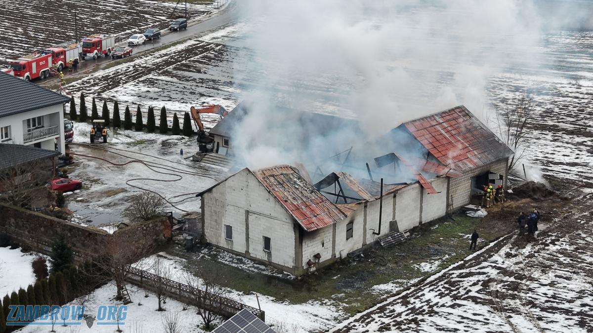 Pożar budynków gospodarczych w gminie Rutki. Z ogniem walczy 8 zastępów strażaków [FOTO+VIDEO]