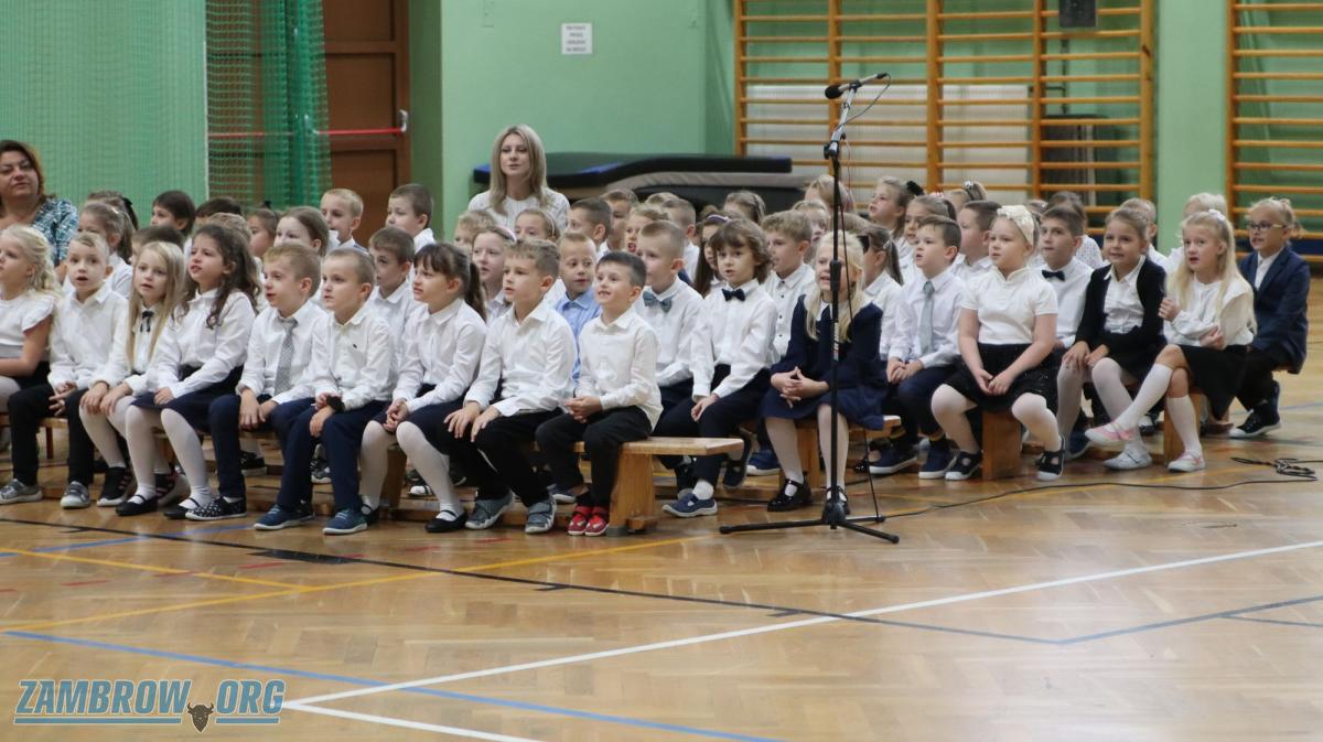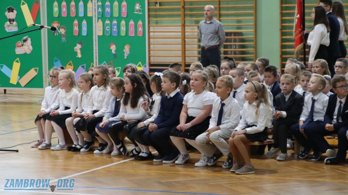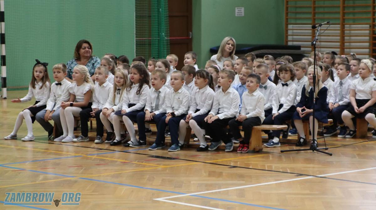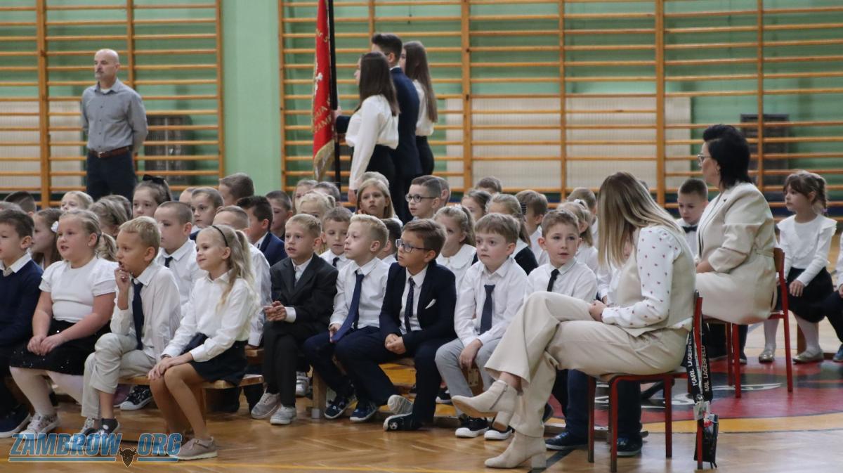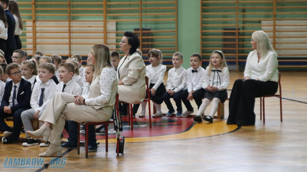 Galeria zdjęć: Uroczyste ślubowanie pierwszaków w Szkole Podstawowej Nr 5 w Zambrowie. Zdjęcia ukazują emocje i radość najmłodszych uczniów podczas ślubowania oraz moment pasowania na uczniów pierwszej klasy przez dyrektora i wicedyrektora szkoły. Każdy pierwszak dumnie prezentuje swój dyplom i upominek, pełen zapału do nauki. To ważne i wzruszające wydarzenie jest idealnym początkiem ich szkolnej przygody.