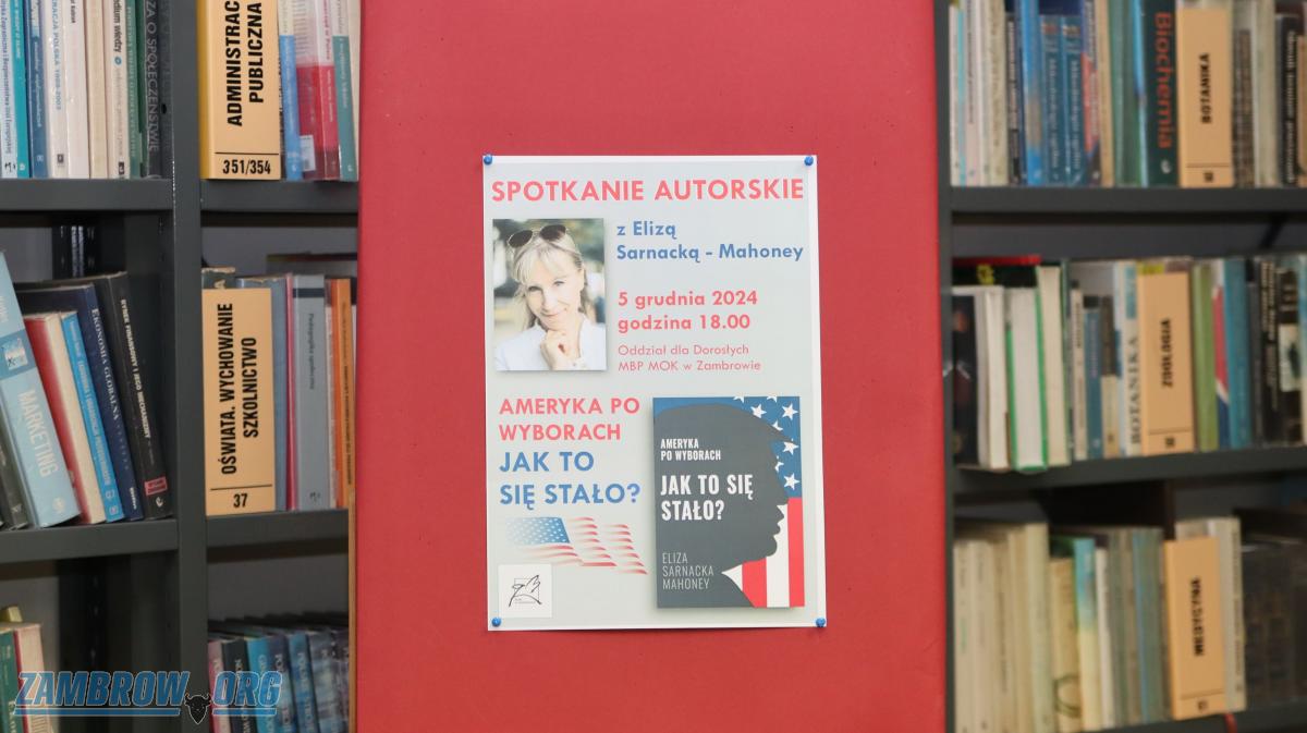 Spotkanie autorskie z Elizą Sarnacką-Mahoney w Miejskiej Bibliotece Publicznej w Zambrowie poświęcone było jej najnowszej książce Ameryka po wyborach. Jak to się stało?. Autorka, ekspertka ds. dwujęzycznego wychowania dzieci, opowiadała o zmianach w USA oraz innych istotnych problemach politycznych. Słuchacze mieli okazję zadawać pytania, a na zakończenie kupić egzemplarz książki z autografem.