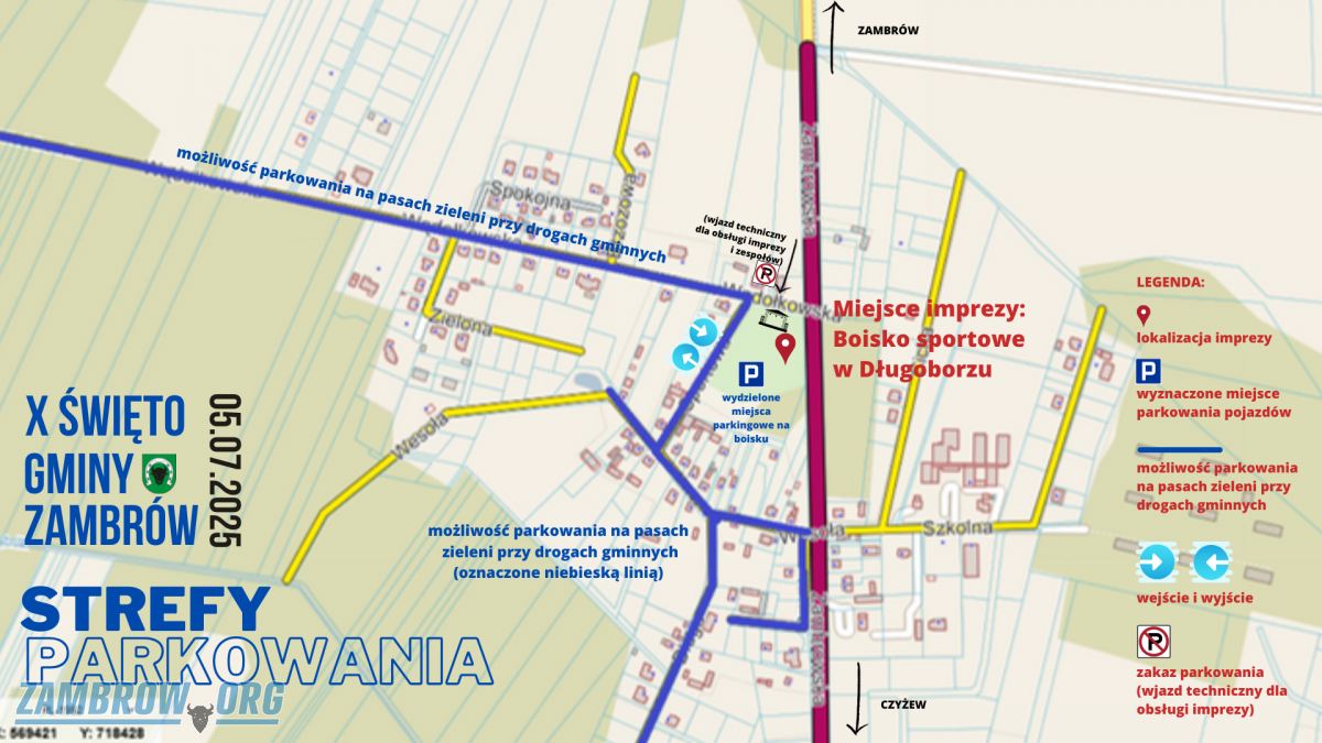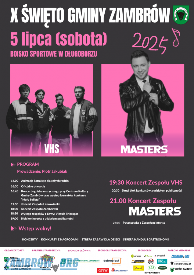 Zapraszamy na X Święto Gminy Zambrów! W najbliższą sobotę, 5 lipca czekać będą koncerty, występy artystyczne i konkursy z nagrodami. Na scenie pojawią się m.in. zespół MASTERS i VHS. Po imprezie potańcówka z Intense. Organizatorzy przewidzieli wydzielone miejsca parkingowe oraz pomoc Straży Pożarnej. Ważne - prosimy o stosowanie się do wskazówek i oznaczeń. Bawmy się bezpiecznie!