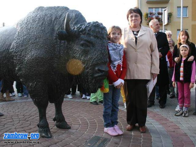 Matka chrzestna pomnika żubra - Krystyna Rzodkiewicz ze swoją wnuczką Julką /Fot. Tadeusz Krassowski, www.zambrow.org