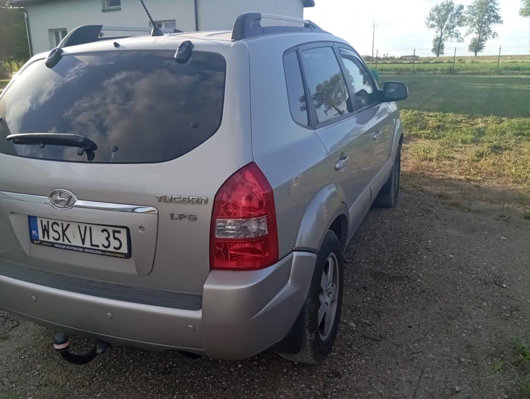 Sprzedam samochód Hyundai Tucson 2,0 benzyna + lpg z roku 2007. Auto w dobrym stanie blacharskim i mechanicznym, lpg m-ki Prins, bogate wyposażenie, m.in. klimatronik, poduszki powietrzne + kurtyny, tempomat, wspomaganie, hak, alufelgi z nowymi oponami wielosezonowymi, radio Pioneer z bluetooth + alarm + system głośnomówiący, ciemna tapicerka welurowa w b.dobrym stanie, przyciemniane tylne szyby, mocne światła do jazdy dziennej, 2 kluczyki z pilotem itp. Kupiony w 2022 r. przy 186.000 km, obecnie 277.000 km. Książka serwisowa od 2022 r. Po wymianie kpl sprzęgła po zakupie i kpl rozrządu z pompą wody przy przebiegu 250.000km w sierpniu 2024 r. Butla ważna do września 2027, przegląd i ubezpieczenie do sierpnia 2026 r. Wymiana oleju za ok. 5000 km. Zapraszam do oglądania w Zambrowie. Wszelkie pytania pod tel. 508-085-105