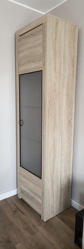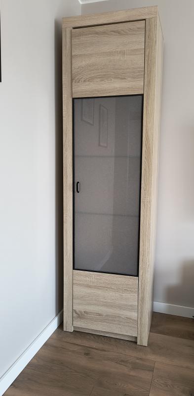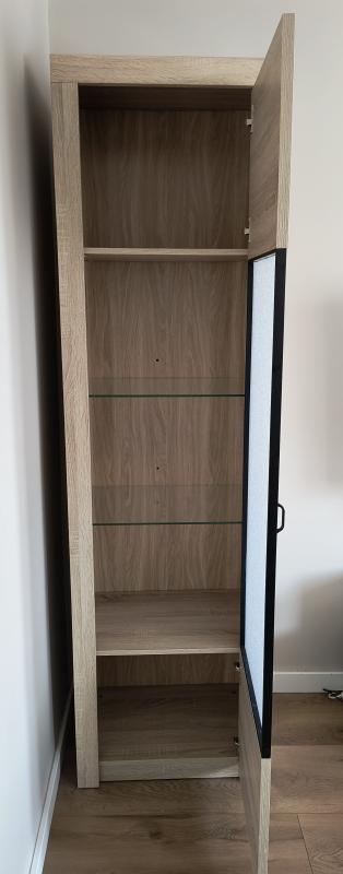 Sprzedam witrynę w bardzo dobrym stanie. Kolor dąb Sonoma. 2 półki drewniane, 2 półki szklane. Szkło od frontu oklejone (można w łatwy sposób zdjąć okleinę). Wymiary Szer. 58.5 cm x gł. 41 cm x wys. 204 cm.