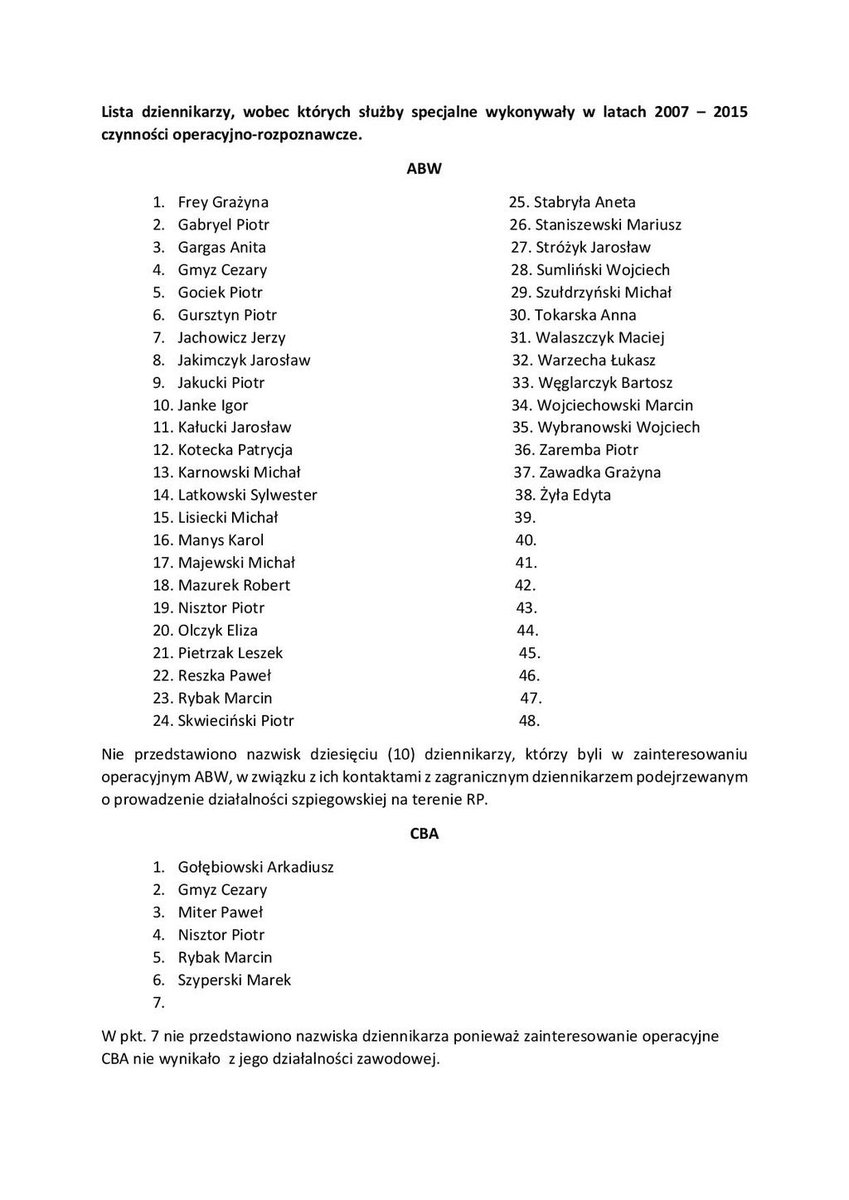 https://www.se.pl/wiadomosci/polityka/rzad-platformy-podsluchiwal-dziennikarzy-zobacz-liste-podsluchiwanych-aa-HafU-5Rnk-EsfV.html<br><p border-box; margin: 0px 0px 24px 86px; padding: 0px; border: 0px; font-size: 18px; vertical-align: baseline; line-height: 32px; color: rgb(34, 34, 34); font-family: "Fira Sans", Arial, Helvetica, sans-serif;">Kto jest na liście podsłuchiwanych osób? Według naszych, ustaleń, są na niej m.in. dziennikarze tygodnika „Wprost”, którzy ujawnili aferę: Sylwester Latkowski, Michał Majewski, Piotr Nisztor, Agnieszka Burzyńska, Cezary Pytlakowski; dziennikarz śledczy „Tygodnika Do Rzeczy” Cezary Gmyz, który publikował stenogramy rozmów w restauracji „Sowa i Przyjaciele”, Wojciech Czuchnowski z „Gazety Wyborczej”, partnerka Marka Falenty - głównego oskarżonego w aferze, żona Sylwestra Latkowskiego, prawnicy: Jacek Kondracki (pełnomocnik tygodnika „Wprost”) i Maciej Małecki (obrońca Marka Falenty).</p><p border-box; margin: 0px 0px 24px 86px; padding: 0px; border: 0px; font-size: 18px; vertical-align: baseline; line-height: 32px; color: rgb(34, 34, 34); font-family: "Fira Sans", Arial, Helvetica, sans-serif;">Dziennikarze mnie kryją oburzenia. - To największa inwigilacja dziennikarzy i adwokatów w historii. Przypomina to działaniem państwo totalitarne. Najbardziej przerażające jest to, że zastosowano całą gamę środków inwigilujących. I zaangażowano w to agentów… - mówi nam Cezary Gmyz, dziennikarz śledczy „Tygodnika do Rzeczy”. W podobnym tonie wypowiada się Piotr Nisztor. - Jestem zbulwersowany skalą podsłuchów. Z moich informacji wynika, że podsłuchiwano mnie, moich znajomych i moją rodziną. Mam nadzieję, że winni tego procederu zostaną ukarani, a ówczesny szef MSW Bartłomiej Sienkiewicz poniesie polityczną odpowiedzialność i stanie przed Trybunałem Stanu– mówi nam Nisztor.</p>